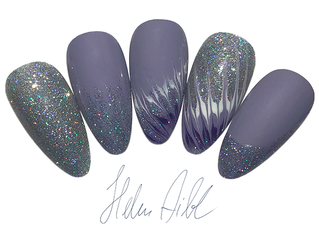 2. Naneste Dry Top a do nevytvrzeného vytvořte diagonální čáry barvou č.02, 42 a 445, rozetřete špičkou štětce na nailart do tvaru paprsků od zdola nahoru a pak mezi paprsky obráceně, shora ke špičce, vytvrďte