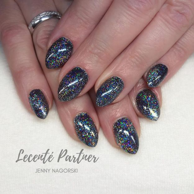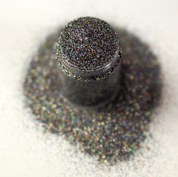 Kovově šedé nailartové glitry s černými podtóny s holografickými odlesky.