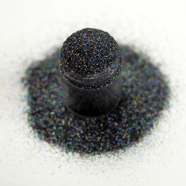 Černé průsvitné glitry s vícebarevnými podtóny. Třpyt se mění podle typu podkladu.