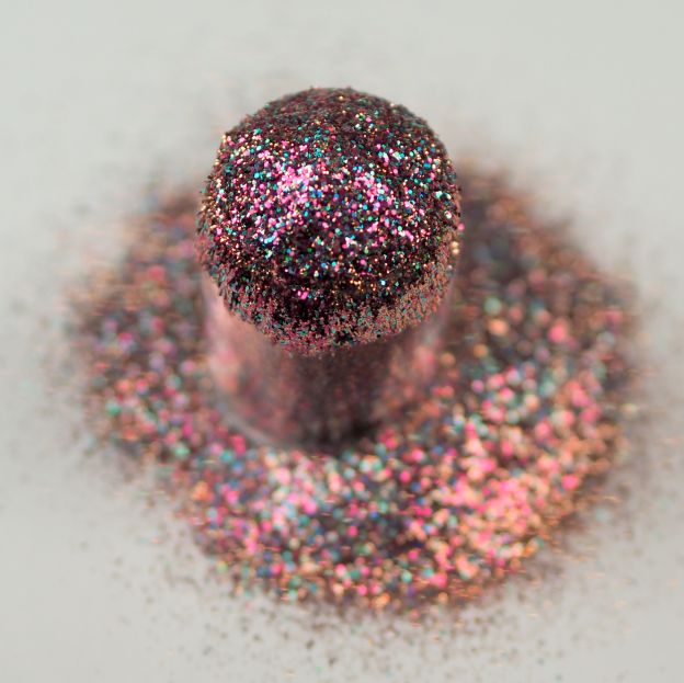 Tříbarevné multi glitry s většími kousky s odlesky zářivě růžové, zelené a zlato-oranžové barvy.