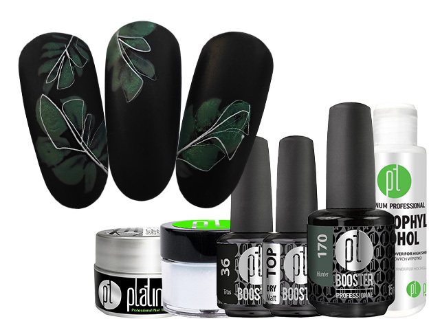 2. Pomocí štětce Platinum One Stroke nakreslete několik lístečků v odstínu BOOSTER COLOR - Hunter (170) a nevytvrzujte.