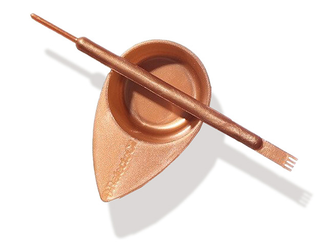 Malá zlatá plastová mistička (1 ks) s komfortní rukojetí a žlábkem pro bezpečné odložení tyčinky + praktická aplikační tyčinka (1 ks) s vydrážkovanou spirálkou na jednom a inovativním hřebínkem na druhém konci.