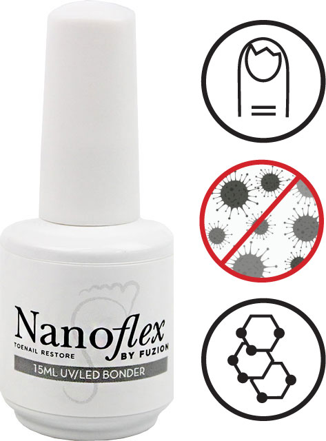 Na připravený, očištěný nehet naneste velmi tenkou vrstvu UV Bonderu pomocí jednorázového aplikátoru. Nechte 15-20 vteřin zaschnout a poté vytvrďte v UV / LED lampě. Nestírejte výpotek a začněte modelovat nehet NanoFlex gelem.