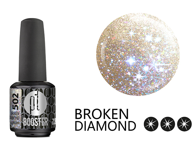 BOOSTER COLOR BROKEN DIAMOND je možné aplikovat jak na barevný podklad, tak samostatně jako barevnou vrstvu. V případě aplikace bez podkladové barvy nanášejte ve 2 vrstvách. Každou vrstvu vytvrďte 30 sekund v LED lampě nebo 2 minuty v UV lampě. Lahvičku před použitím řádně protřepejte.